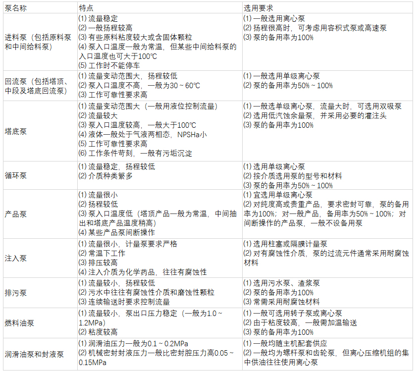 化工生產(chǎn)工藝流程中的典型用泵有:進(jìn)料泵、回流泵、塔底泵、循環(huán)泵、產(chǎn)品泵、注入泵、補(bǔ)給泵、沖洗泵、排污泵、燃料油泵、潤滑油泵和封液泵等,其特點(diǎn)和選用要求見下表。