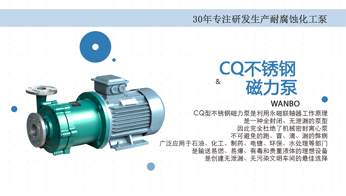 設(shè)計(jì)特點(diǎn):磁力泵以靜密封取代動(dòng)密封,使泵的過(guò)流部件處于完全密封狀態(tài),徹底解決了其他泵機(jī)械密封無(wú)法避免的跑、冒、滴之弊病。用途:可廣泛應(yīng)用于化工、制藥、石油、電鍍、食品、電影照相洗印、科研機(jī)構(gòu)、國(guó)防工業(yè)等單位抽送酸、堿液、油類、稀有貴重液、毒液、揮發(fā)性液體,以及循環(huán)水設(shè)備配套、過(guò)濾機(jī)配套。特別是漏、易燃、易爆液體的抽送,選用此泵則更為理想。。流量范圍:1.2T/h-60T/h,揚(yáng)程范圍:5m-50m,功率范圍:0.12kw-18.5kw,運(yùn)行溫度:-30℃—120℃??筛鶕?jù)實(shí)際工況要求變更配置。